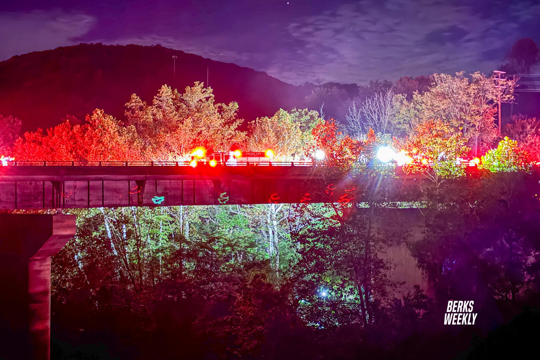 Accident on 422 west in Cumru Township near the Schuylkill River Bridge (just before Lancaster Ave), reported to be a vehicle that struck the median and launched off the highway bridge and landed down near the river, initially described as on fire.