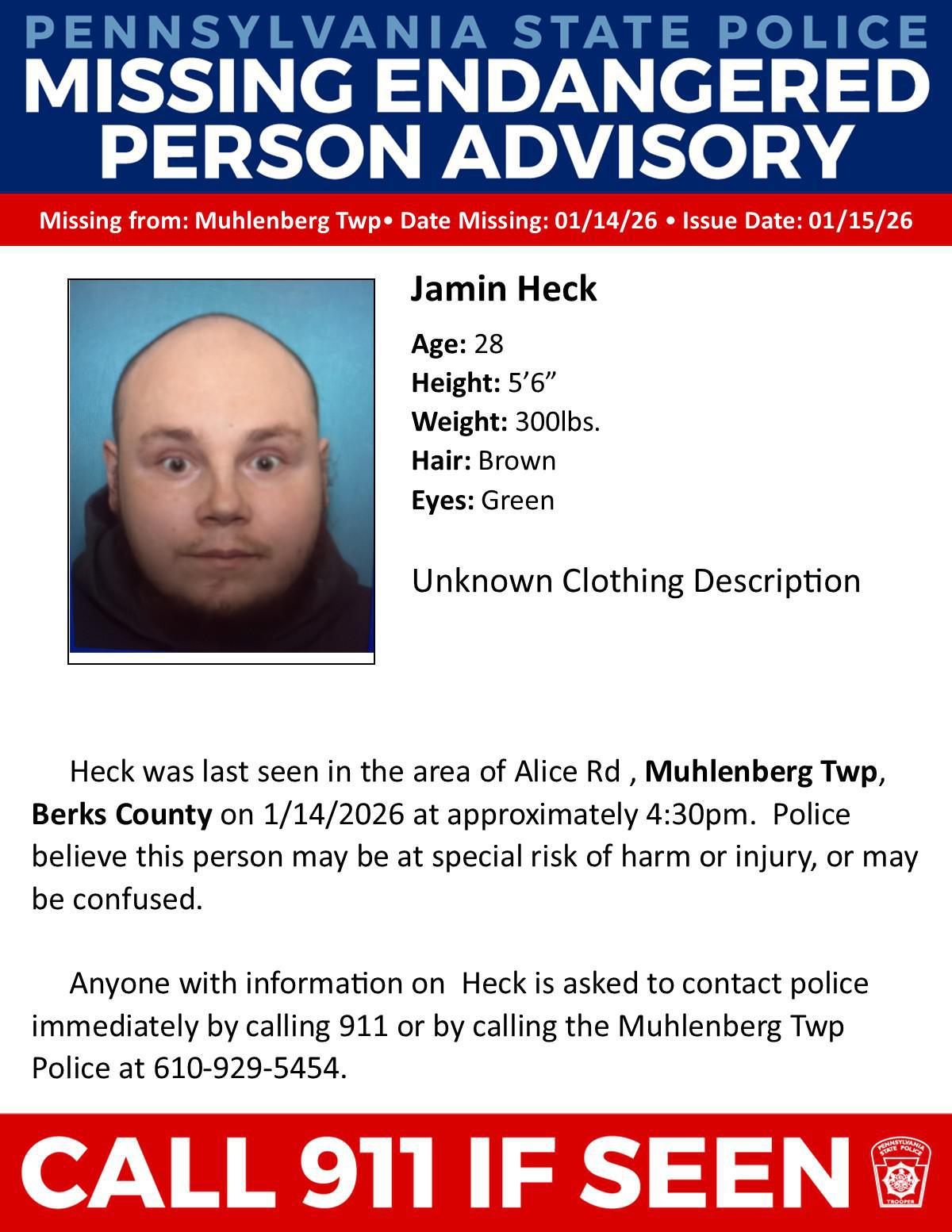 Missing Endangered Person Advisory. Muhlenberg Twp Police is searching for Jamin Heck. Call 911 if seen.