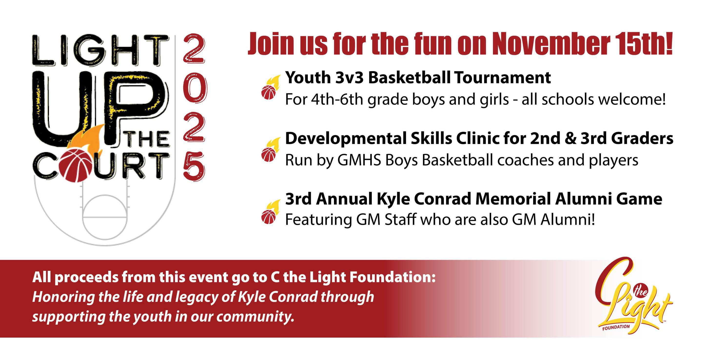 Please join us for this year's Light Up The Court - a day of fun and basketball to raise funds for C the Light Foundation, honoring the life and legacy of former GM boys basketball coach, Kyle Conrad.